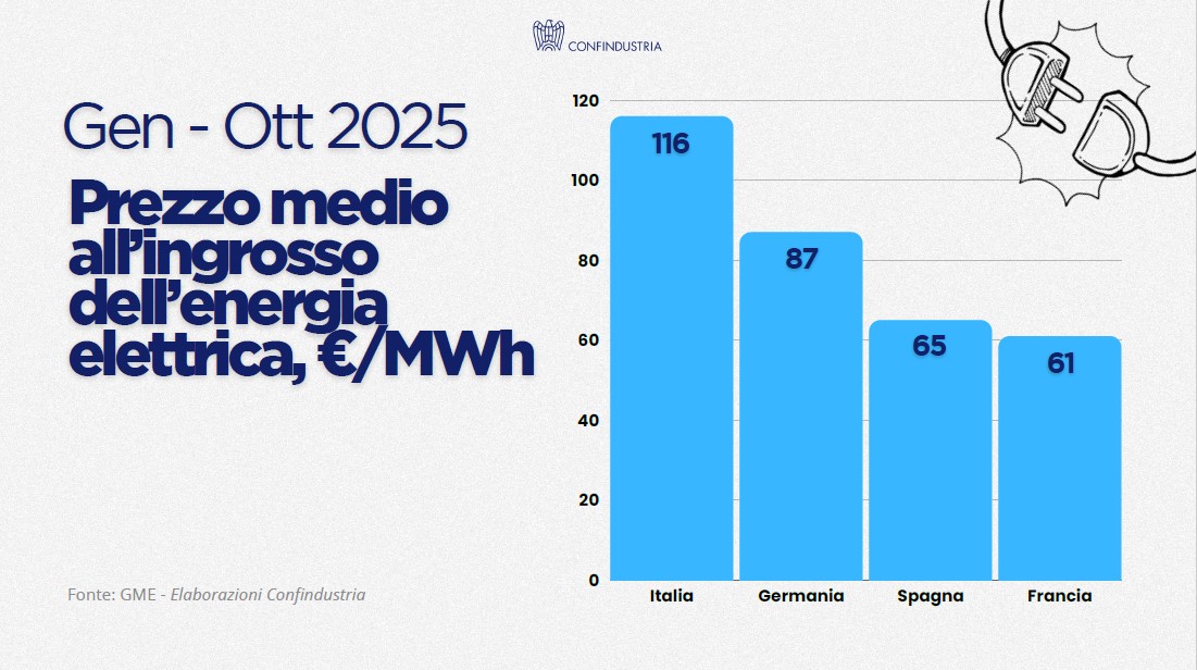 Secondo i dati GME (gennaio–ottobre 2025), il prezzo medio dell’energia elettrica all’ingrosso in Italia è stato di 116 €/MWh, contro gli 87 della Germania, i 65 della Spagna e i 61 della Francia.